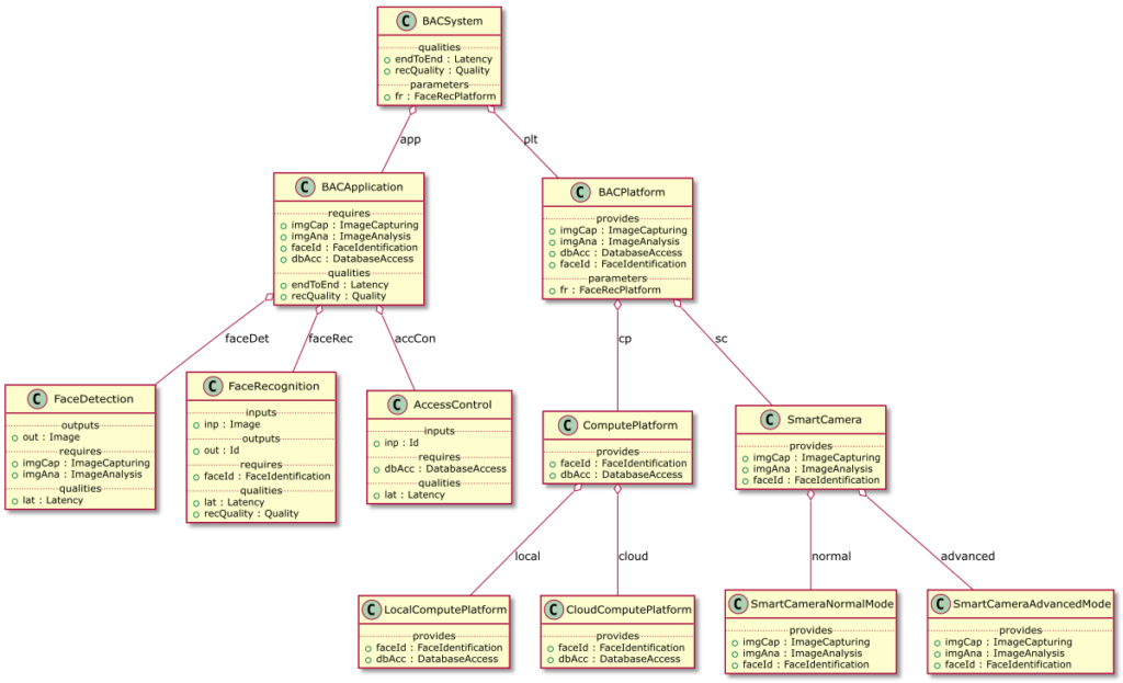 The following diagram shows the component hierarchy of the BAC model. Relations between component with diamonds end points indicate component aggregations, or alternatives. It has been automatically generated with the QRML tooling on the basis of the QRML model.