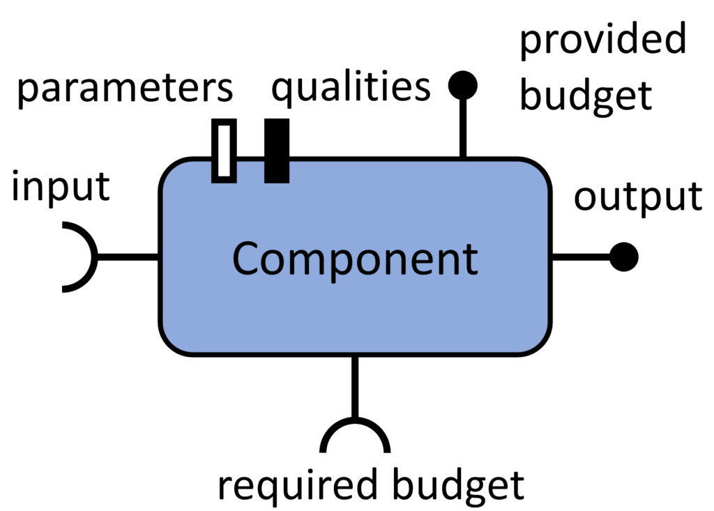 The key concept in QRML is the component. A component has an interface consisting of six parts, inputs, outputs, required budgets, provided budgets, qualities, and parameters.